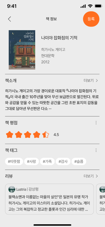 독서 경험을 공유하고 인사이트를 나누는, 독서 특화 SNS 플랫폼! 피드를 통해 게시글을 작성 및 공유할 수 있고, 댓글과 인용으로 책에 대해서 사람들과 소통할 수 있습니다. 평점과 태그를 통해 다른 사람들의 도서에 대한 감상을 쉽게 얻고, 내 취향이 반영된 읽을 책들을 추천 받을 수 있습니다.