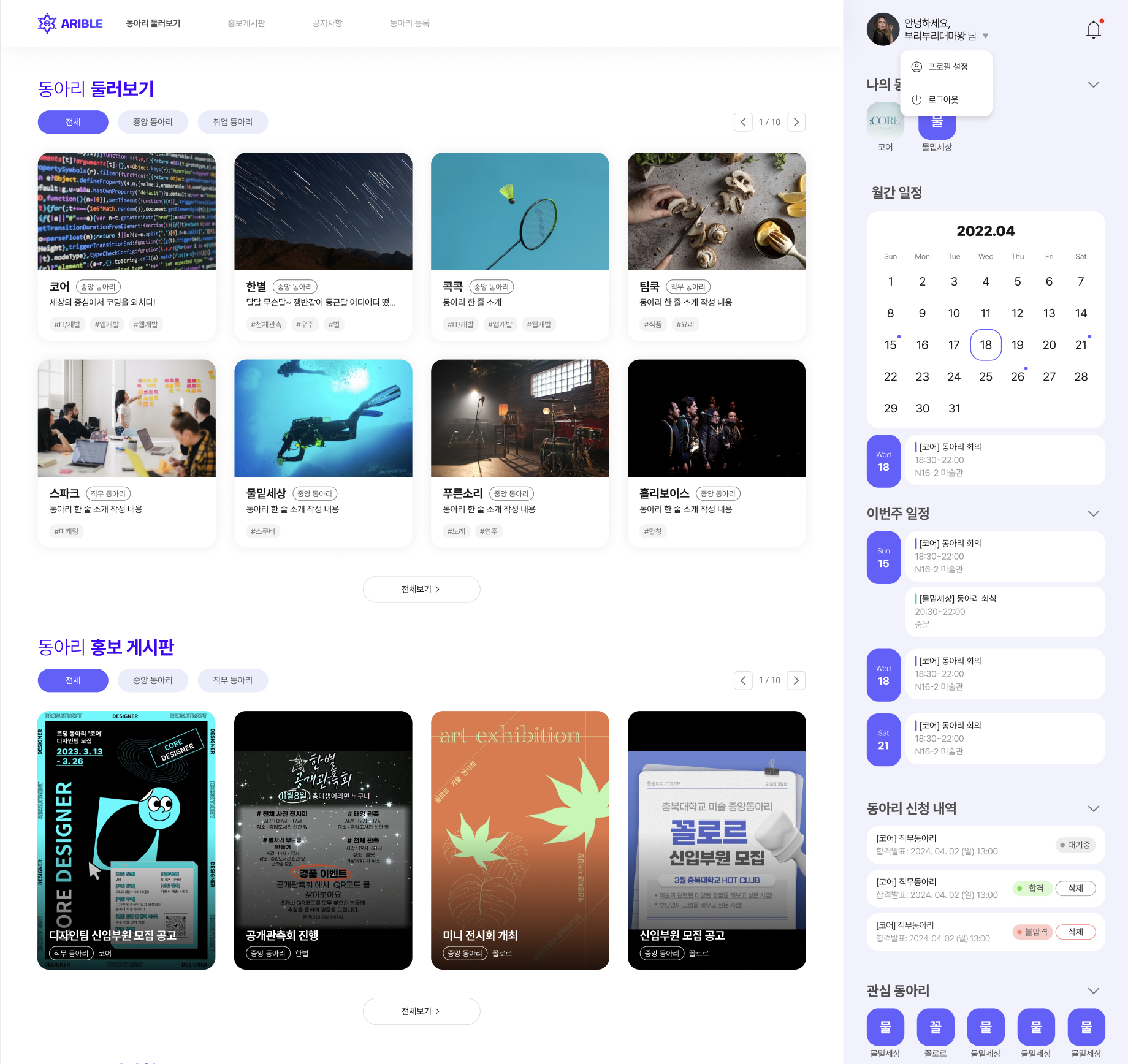 동아리 임원들의 동아리 관리를 쉽도록 도와주는 동아리 관리 플랫폼입니다. 동아리 소개, 활동, 지출 내역, 공지사항 및 일정 등을 함께 공유하고 기록할 수 있으며, 동아리를 다양한 사용자에게 널리 알릴 수 있습니다.